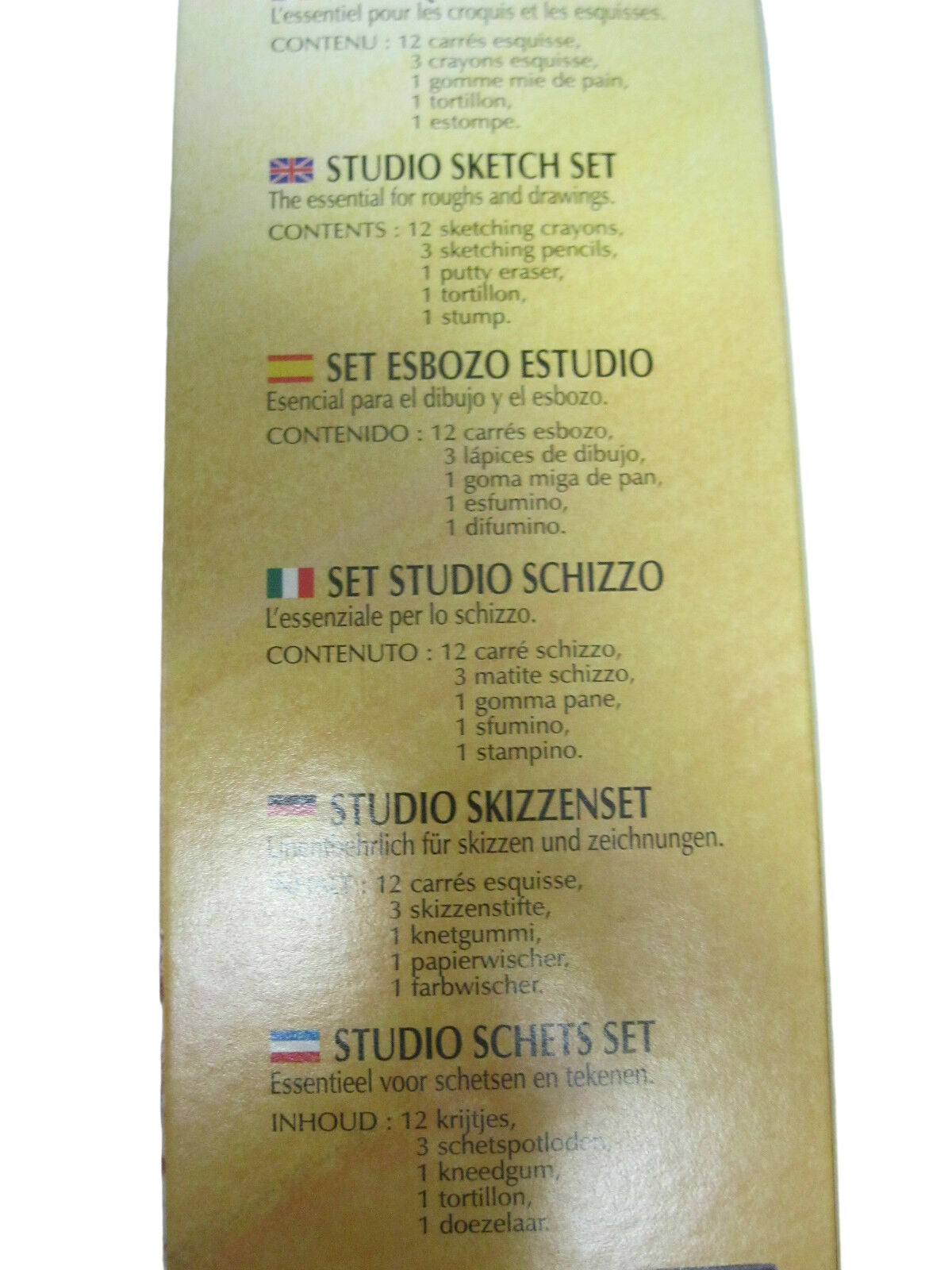set includes 12 sketching square crayons, 3 sketching pencils, 1 putty eraser ,1 blending stump, 1 tortillon